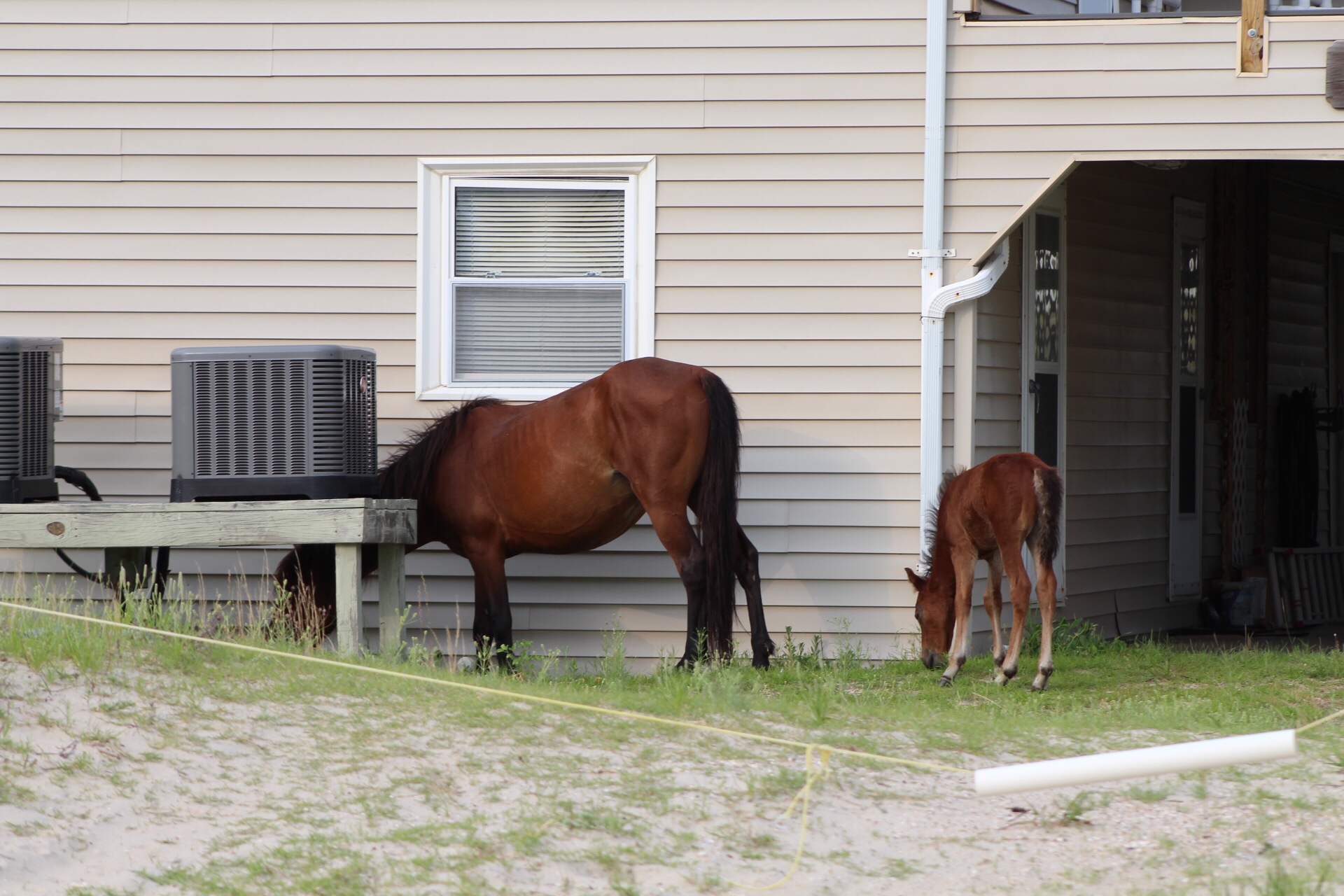The tour was fantastic. It included a good bit of the natural and human history of the area as well as the horses. Pippy masterfully guided the Hummer back into the dunes. The first thing that struck me about the area was the number of gigantic beach houses interspersed among the dunes. I want to be clear here. There are no roads. To get to these mostly two-story homes built on at least one story of stilts to avoid the floods, people have to have 4X4 vehicles to navigate the dunes and trapped water in the area. Also, I don’t quite understand how they’re building in a wildlife refuge, but this is much more like the America I know. If you’ve got a cool million to throw at a beach house in a probable flood plain that has no roads and requires a rugged vehicle to reach it, we’ll find you a permit to build. But I digress. We were back in the dunes about five minutes before finding our first harem of horses. The herd is made up of about 100 horses, but these split off into harems as the males are quite territorial. A harem is comprised of at least one stallion and one mare, but – to quote Pippy, “The stallion will take on as many mares as he can handle, usually 3-5.” The horses are beautiful, and I’m sure they are wild. However, they’re certainly not easily spooked. As we drove around the only navigable parts of the dunes, we frequently came quite near the horses as we passed by slowly. We were even treated to a good look at the herd’s only colt of the season, as he was eating grass next to an outdoor air conditioning unit in the backyard of one of the mega-houses. In all cases, the horses went on about their business grazing and doing what horses do as we and other tour companies patrolled the area.While we did not see horses running and frolicking in the waves as the pictures in our condo would suggest, it was still an excellent experience. We learned a little history, saw a good bit of the dunes between the Atlantic and the Currituck Sound, got fairly up close and personal with some wild Spanish War Horses, and got to do all of it in the comfort of a well-navigated Hummer. If this is life at the beach, I am revising my future beach-going trepidation.